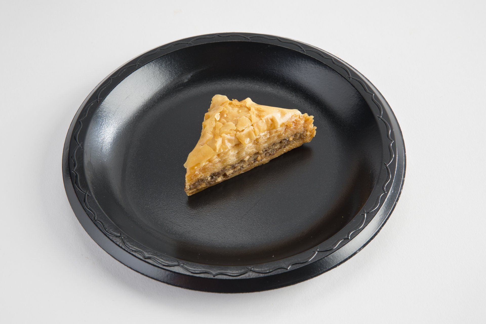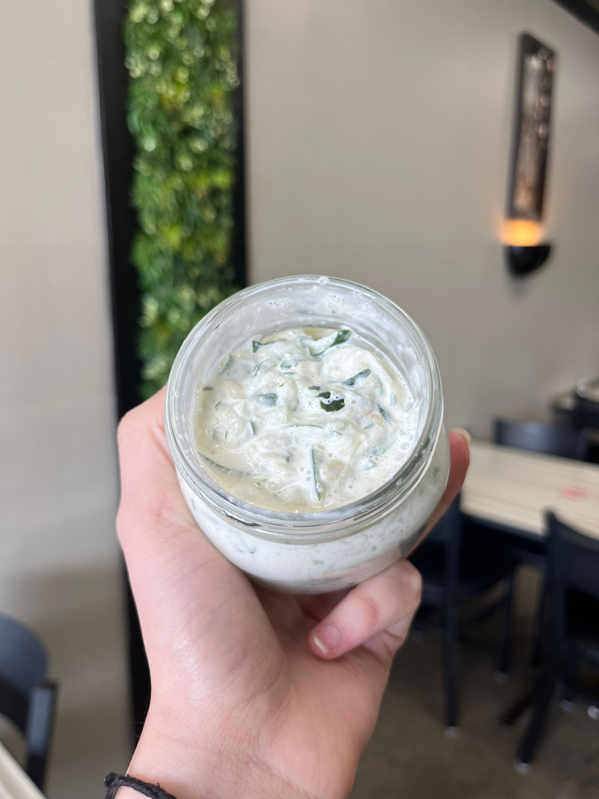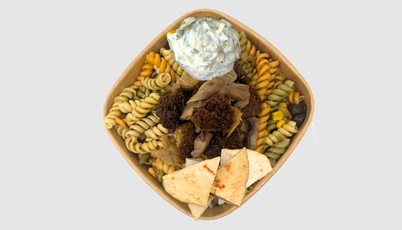 Salad, falafel, grape leaves, fajita sauce, cucumber sauce, hummus, spankopita, 1/2 pita, peppers, pickles, and olives